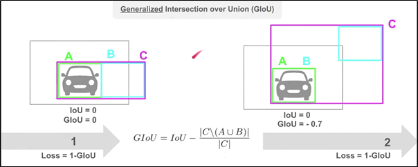 - GIoU: 두 박스를 모두 포함하는 최소 영역인 C 박스 활용