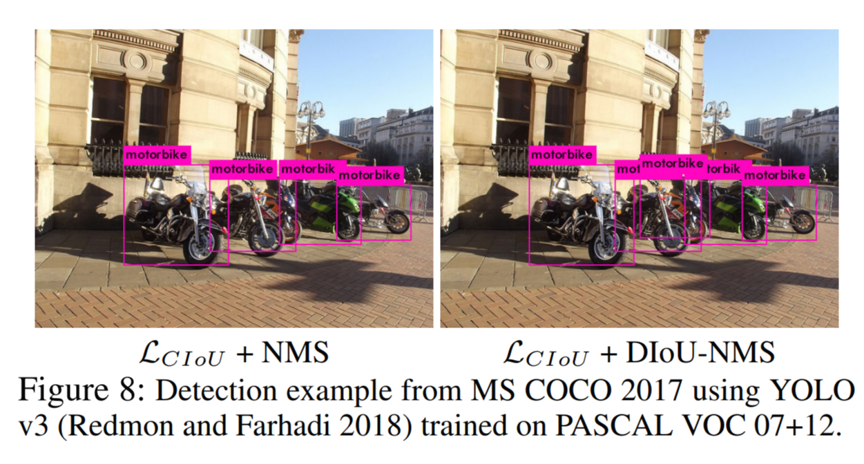 @ DIoU를 NMS에 적용 시 위 그림처럼 동일한 class의 GT가 여러 개 겹쳐져 있는 경우 IoU에 비해 robust 한 것을 확인할 수 있다.