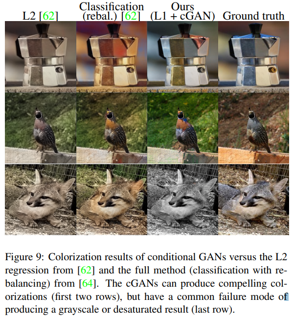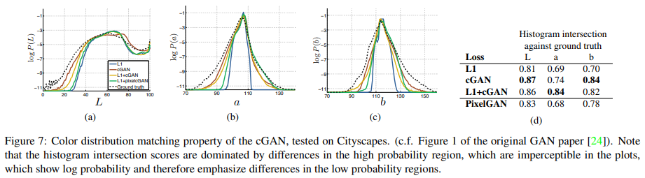 L1이 실제보다 더 좁은 분포로 이어지고, 평균적으로 회색빛을 조장함. cGAN의 분포는 실측값에 더 가까워짐