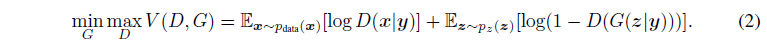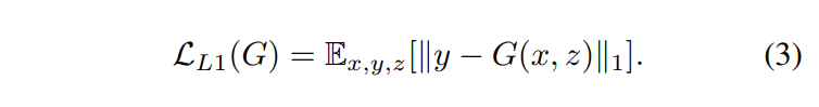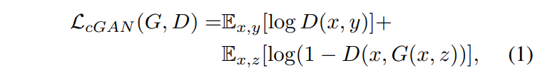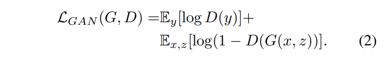 z가 없으면 network는 x에서 y까지의 매핑을 학습할 수 있지만 결정론적 output을 생성하므로 delta function 이외의 어떤 분포와도 일치하지 않는다 (주어진 이미지에 대해 오직 하나의 output만을 생성). 과거 conditional GAN은 이를 인정했으며, x 외에 가우스 노이즈 z를 G에 대한 input으로 제공한다.