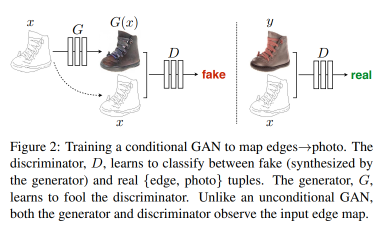 GAN은 random noise vector z에서 output 이미지 y, G : z → y까지의 매핑을 학습하는 생성 모델이다. 반면, conditional GAN은 observed image x와 random noise vector z에서 y, G : {x, z} → y로의 매핑을 학습한다.