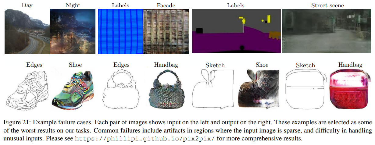 이 논문의 결과는 conditional adversarial networks가 많은 이미지 변환 작업, 특히 고도로 구조화된 그래픽 출력을 포함하는 작업에 유망한 접근 방식임을 시사한다. 이러한 network는 직면한 task와 데이터에 적응한 loss를 학습하므로 다양한 분야에 적용할 수 있다.