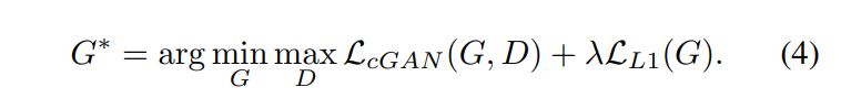 D의 역할은 변하지 않지만, G는 D를 속일 뿐만 아니라 L2 distance에서의 ground truth에도 가깝도록 만들어야 한다 (=흐리지 않게 + real에 가깝게 이미지 생성). 그리고 L2보다 L1을 사용하는 것이 덜 흐린 이미지를 생성하는 데 도움이 된다.