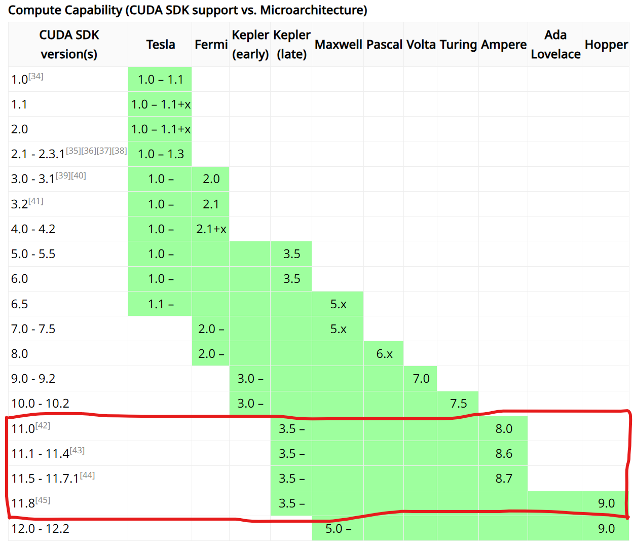 - compute capability에 따른 CUDA 버전 확인 (CUDA 버전: 11.0~11.8 가능)
