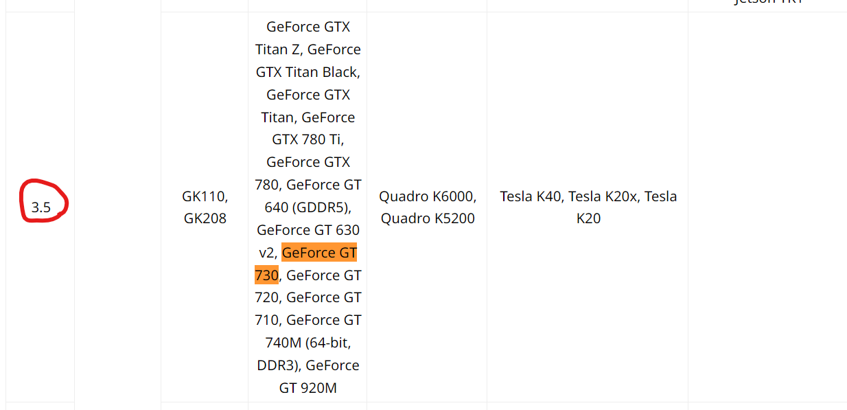 - https://www.wikiwand.com/en/CUDA#/GPUs_supported 에서 그래픽 카드 명 검색 및 compute capability 확인 (compute capability : 3.5)