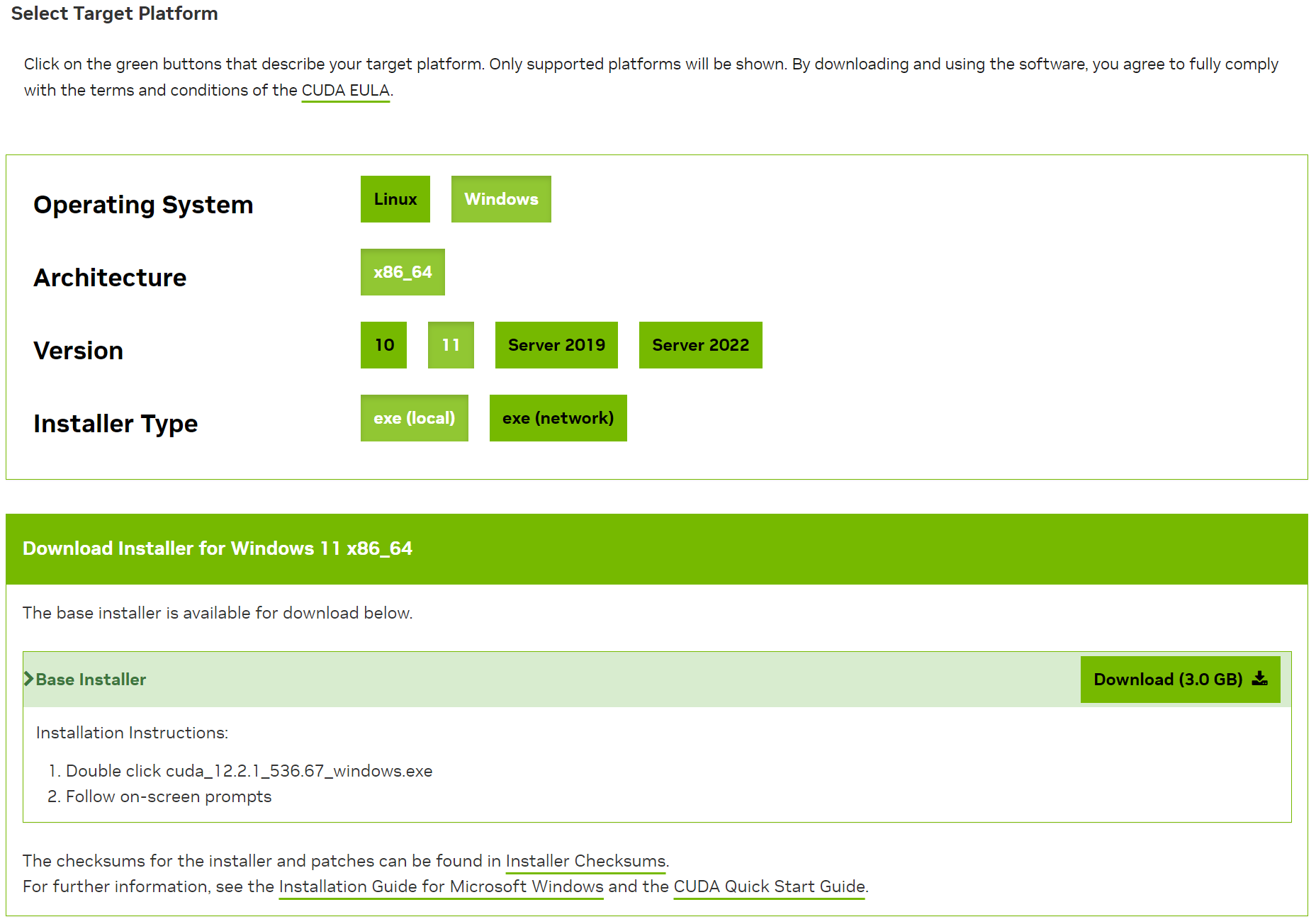 - https://developer.nvidia.com/cuda-downloads 본인 스펙에 맞게 선택 후 Download