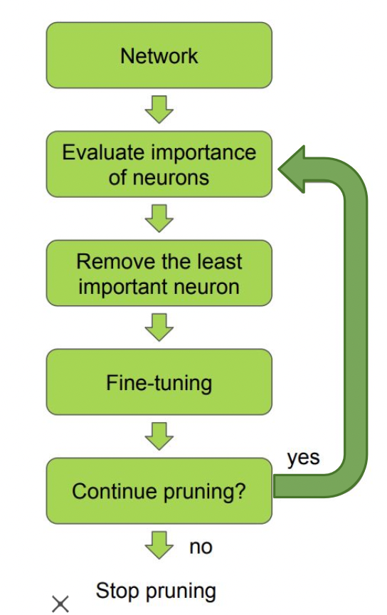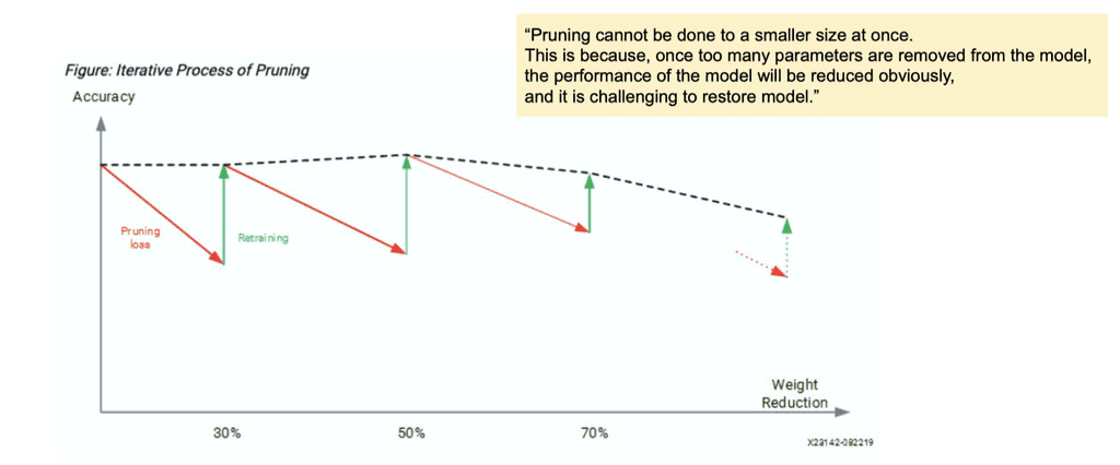 => 한번에 많은 파라미터가 pruning되면, 성능이 급격히 하락한다. 따라서, 반복적으로 조금씩 파라미터를 줄여나가는 방법이 주로 사용된다.