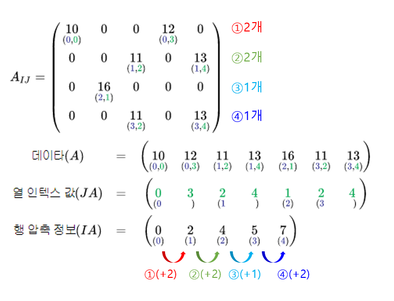 - CSR : 0이 아닌 값의 값과 열을 별도의 메모리에 저장하고, 행은 포인터(주소값)형태로 가지고 있는 방법 (2a+(n+1)개 메모리 필요, n=행의 길이)