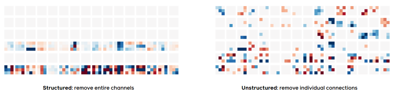: 독립적으로 수행하는 것 (matrix 내 값 하나하나를 검토하여 가지치기 수행) -> 보통 0근처의 weight를 가지치기함. 높은 비율로 pruning 가능함. But. weight를 0으로 변경할 뿐, matrix 연산은 그대로 수행해야 하기 때문에 inference 속도는 그대로임.