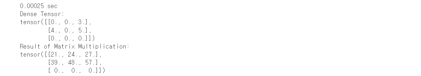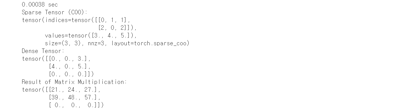 # 희소 Tensor 생성 dense_tensor = torch.Tensor([[0, 0, 3], [4, 0, 5], [0, 0, 0]]) s=time.time() # 밀집 Tensor와의 행렬 곱셈 dense_matrix = torch.Tensor([[1, 2, 3], [4, 5, 6], [7, 8, 9]]) result = torch.mm(dense_tensor, dense_matrix) e=time.time() print(f"{e - s:.5f} sec") print("Dense Tensor:") print(dense_tensor) print("Result of Matrix Multiplication:") print(result)