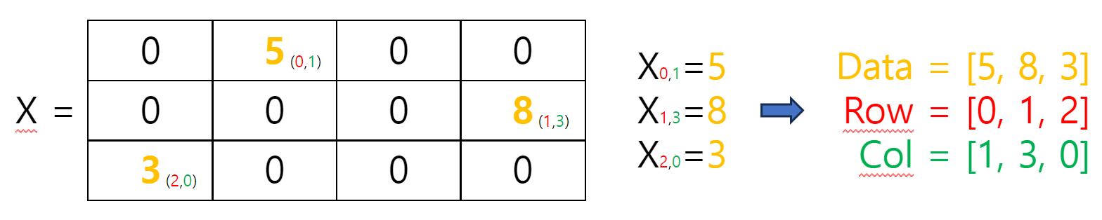 위의 예시에서는 기존 12개 메모리가 필요했으나 COO를 활용한다면 9개의 메모리만 사용한다.