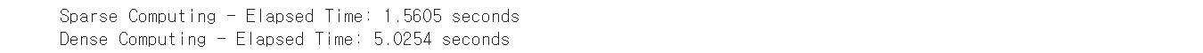 간단하게 행렬곱에서 희소 행렬을 사용했을 때와 사용하지 않았을 때의 시간을 비교해보았다.