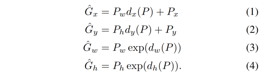 transformation을 4가지 함수 dx(P), dy(P), dw(P) 및 dh(P)로 파라미터화한다. dx(P)와 dy(P)는 P bounding box의 center에 대한 scale-invariant translation을 특정하고, dw(P)와 dh(P)는 P bounding box의 폭과 높이에 대한 로그 공간 변환을 특정한다. 이러한 feature를 학습한 후, 우리는 tranformation을 적용하여 input proposal P를 예측된 ground-truth G(hat)으로 변환할 수 있다.