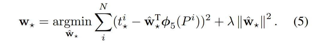 d*(P)는 proposal P의 pool(5)의 linear 함수로 모델링 되며, φ5 (P)가 image data에 의존하는 것으로 가정된다. 따라서 d*(P) = wT(*)φ5 (P)를 가진다. w(*)는 학습가능한 model parameter이고, regularized least squares objective (ridge regression)를 최적화하여 w(*)를 학습한다.