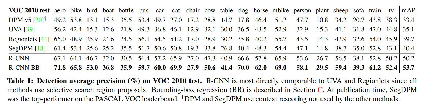 R-CNN BB는 동일한 region propoal 알고리즘(selective search) 을 사용하는 UVA과 비교하여 mAP가 18.6%가량 향상되고, 속도 또한 훨씬 빠르다.
