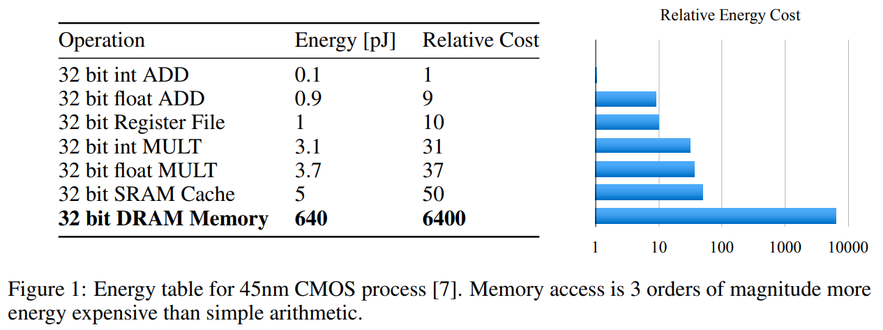 이러한 거대한 신경망은 성능은 매우 높지만, 이는 많은 메모리 및 계산 자원을 요구한다. 아래 그림 1은 45nm CMOS process에서의 기본 산술 및 메모리 연산의 에너지 비용을 보여준다.