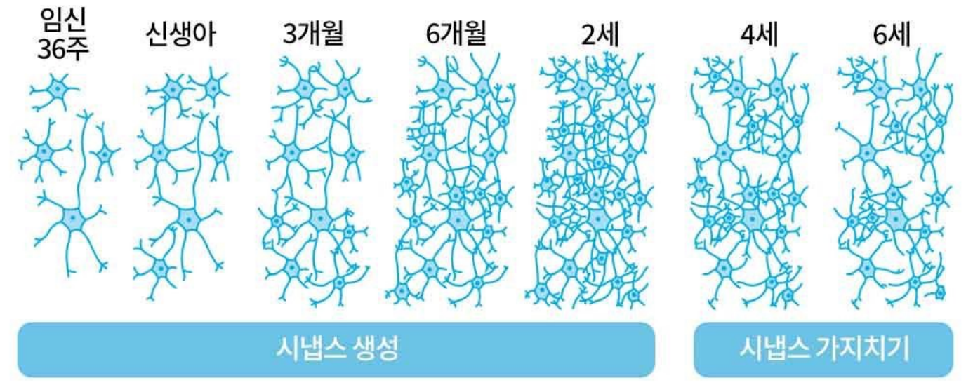 (실제로 인간은 만 3세까지 뉴런과 뉴런을 연결해주는 시냅스의 수가 늘어나고, 반복과 연습을 통해 시냅스가 강화된다. 4세 이후에는 사용되지 않는 시냅스는 pruning된다.)