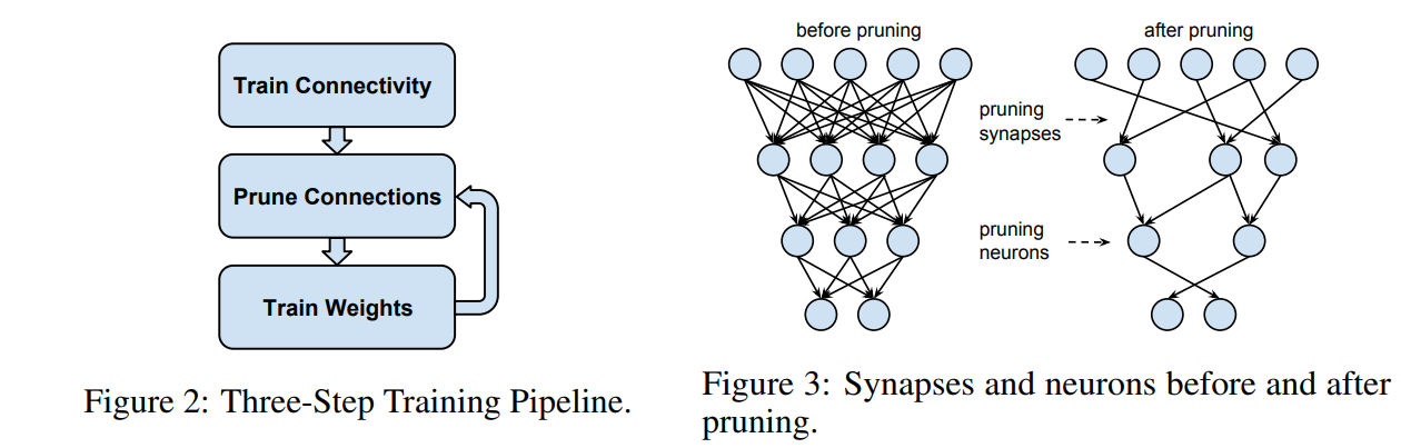 신경망 모델은 많은 양의 계산 및 메모리를 요구하기 때문에 임베디드 시스템에 활용하기 어렵다. 또한 기존 네트워크는 한번 아키텍처를 설정하면, 학습과정에서는 변경할 수 없기 때문에 아키텍처를 개선해 나갈 수 없다 (아키텍처를 수정하려면, layer를 수정하고 또 다시 학습을 해야된다는 말). 본 논문에서는 이를 해결하기 위해 중요한 connection만 학습하여 정확도에 영향을 미치지 않고 신경망에 필요한 계산 및 메모리를 10배 줄일 수 있는 방법을 제안한다. 다음과 같은 3단계를 통해 rebundant connection을 pruning한다.