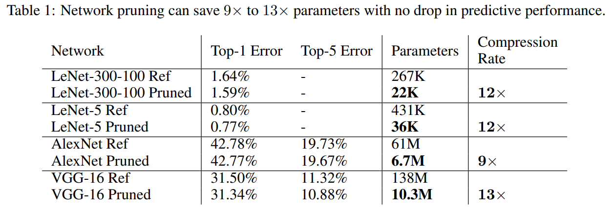 MNIST의 Lenet-300-100, Lenet-5, 그리고 ImageNet의 AlexNet VGG-16으로 4개의 대표적인 네트워크를 pruning하였으며, pruning 전후의 네트워크 파라미터 및 정확도는 Table 1과 같다.